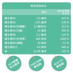 - 酵母B群 400mg(此為天然成分之總量,其中包含酵母、菸鹼酸B3、本多酸鈣B5、鹽酸吡哆辛B6、鹽酸硫胺明B1、核黃素B2、葉酸B9、生物素B7、氰鈷胺明B12)